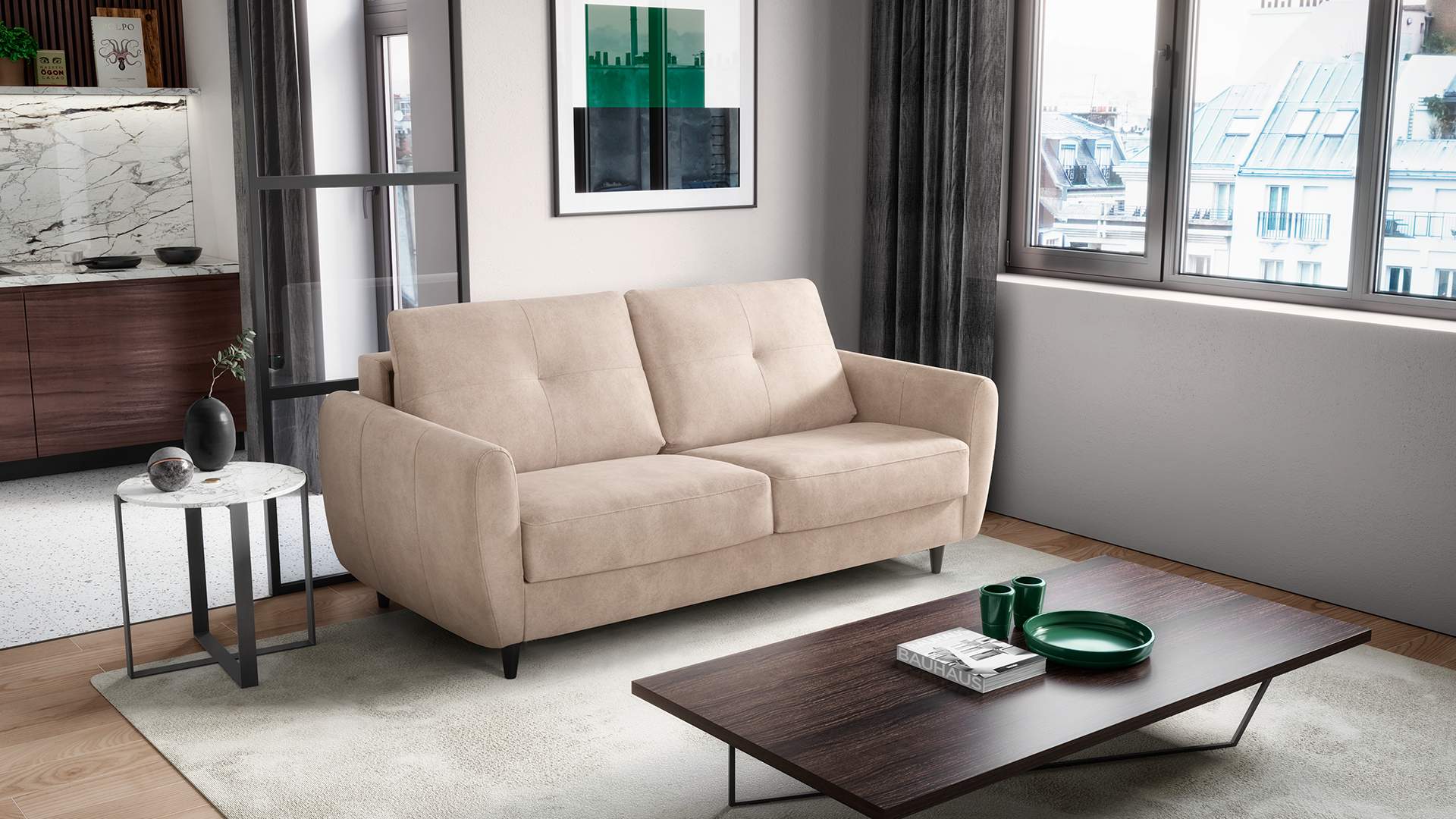 O sofá cama SAHARI é a solução ideal para quem valoriza versatilidade e design. Durante o dia, serve como um elegante sofá que se integra perfeitamente na sua sala. À noite, transforma-se numa cama confortável.